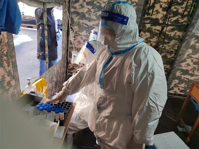 “您好,請規范帶好口罩?!薄罢埓蠹易⒁獗3忠幻组g隔距離,不要擁擠?!?日的清晨天空中飄著雪花,產投的志愿者們已經投入到各自崗位中,或維持核酸檢測秩序,或進行掃碼準備……